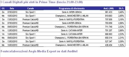Tra i canali Digitali la classifica, dove Sky Sport Uno con la partita di seria A “Inter -Genoa” (961 mila e 3,5% di share) risulta ancora leader, è interamente occupata da programmi a contenuto sportivo .