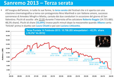 Crisi di ascolti per questa terza serata che ha ottenuto un’audience media di 10.708.283 telespettatori e si è fermata al 42,5% di share. La prima parte del Festival ha registrato una diminuzione del -9,9% rispetto alla prima parte della puntata omologa della kermesse 2012. Rispetto alla seconda puntata di mercoledì 13 ha ottenuto un -5,4%.