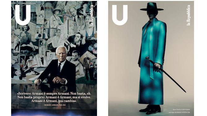 Ogni uscita di “U La Repubblica” prevederà due cover: una dedicata ai protagonisti delle interviste, nel primo numero lo stesso Giorgio Armani, e una incentrata sulla parte moda, in questo caso firmata dal maestro della fotografia contemporanea Paolo Roversi. Per il 2024 sono previste altre 5 uscite del magazine, mentre nel 2025 si passerà a otto uscite. “U La Repubblica” sarà in edicola il primo giorno in omaggio con Repubblica, e acquistabile per il resto del mese al prezzo di 3€.