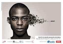 costumi dominanti, sempre più imbarbariti. Quattro i soggetti creati dall’agenzia Armando Testa e riprodotti in cartolina.Immagini forti che rappresentano uomini e donne che, solo per la loro etnia, la religione, il colore della pelle, o semplicemente per l’aspetto fisico, vengono bollati con i termini più spregiativi: 'ladro', 'terrorista', 'negro', 'ciccione'. E le parole sono come proiettili che nella raffigurazione attraversano il cranio di queste persone disintegrandolo.