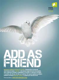 Dopo il sostegno iniziale di grandi aziende e brand che per Internet for Peace hanno realizzato ad hoc pagine adv sul tema - pubblicate da Wired Italia - ora la creatività si sposta fuori dalle pagine del mensile di tendenza e tecnologia di Condé Nast per raggiungere nuove riviste del gruppo e nuovi partner editoriali: dal mese di febbraio sarà on air la nuova campagna pubblicitaria ideata da Ogilvy Italia (partner creativo di Internet for Peace dall’inizio della sua avventura) raffigurante il simbolo della pace per eccellenza, una colomba immortalata dalla celebre fotografa Gill Greenberg. La campagna sarà pianificata su tutte le testate Condé Nast in Italia e raccoglie anche l’appoggio del settimanale Internazionale. Oltre confine la nuova creatività sarà presente su Wired Uk e Wired USA, GQ Francia,Germania, Russia, Giappone, Sud Africa e Romania, Vanity Fair Spagna e Uk, Glamour Olanda e Romania, Vogue Russia.