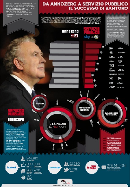 Grazie alla capacità di comunicazione delle immagini vengono sintetizzati dati complessi che mettono in luce come con 'Servizio Pubblico' il conduttore sia abilmente riuscito a recuperare un deficit di visibilità grazie a un articolato sistema di comunicazione Tv multipiattaforma e Digital (con il coinvolgimento di YouTube, Facebook e Twitter).