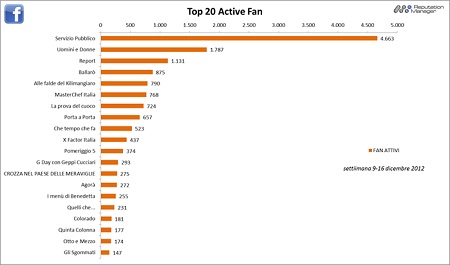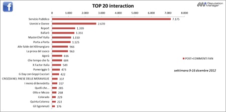 Facebook. Dopo molte settimane all’ombra di X Factor, il talent show più social dell’anno, Servizio Pubblico riconquista la prima posizione per fan attivi (4.633) e livello di interazione (7.175 post e commenti dei fan) seguito da Uomini e Donne (1787 fan attivi hanno scritto 2670 post e commenti). Salgono anche Report e Ballarò, e Masterchef Italia, che il 13 dicembre ha iniziato la sua seconda edizione su Sky Uno, si piazza tra i primi cinque programmi con l’interazione più alta.