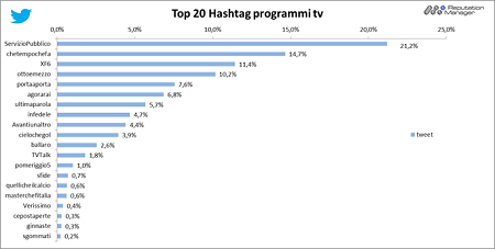 Twitter. #ServizioPubblico è al primo posto con il 21% dei tweet totali, seguito da #chetempochefa. Contrariamente a quanto avvenuto su Facebook, #xf6 resiste tra i primi tre anche se con un audience decisamente ridimensionata (11,4% dei tweet).