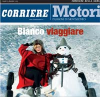 Corriere Motori fa sognare i suoi lettori e spinge al massimo le potenzialità delle auto con due 'imprese' da non imitare: scendere su una pista da slittino in Alto Adige con una Ferrari FF, o sempre sulle piste, 'sciare' a Madonna di Campiglio e a Cortina con una Fiat Panda 4x4 e una Range Rover. E ancora alla prova sulla neve ci sono l’Audi RSQ3, la Mini Paceman, la Maserati Ghibli, la Kia Sportage, la Ford Kuga, la Volvo XC60, la Opel Insignia Country Tourer, la Hyundai ix35, la Citroën DS5 Hybrid4, la Renault Koleos, la Toyota Rav4, la Nissan Juke Nismo e la Peugeot 3008 Hybrid4.