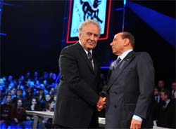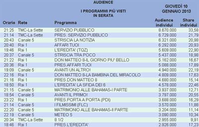 Ieri sera, 10 gennaio, quasi 9 milioni di italiani erano incollati davanti al televisore a vedere lo show di Silvio Berlusconi a 'Servizio Pubblico', su La7. 33,58% di share per il programma che ha visto il Cavaliere incalzato dal presentatore Michele Santoro e dai giornalisti Marco Travaglio, Luisella Costamagna e Giulia Innocenzi, tra momenti di tensione e attimi quasi comici.Con 8.670.000 spettatori il programma ha segnato il record assoluto di ascolti per La7, dopo aver sfiorato l'impresa all'esordio del suo programma, il 25 ottobre 2012, con 2.985.000 spettatori e il 12.99% di share, avvicinando il risultato ottenuto dalla prima puntata di 'Quello che (non) ho' di Fabio Fazio e Roberto Saviano (3.036.000 spettatori e 12,66% di share), andata in onda il 14 maggio 2012.
