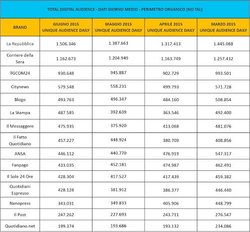 La classifica è basata sui dati Total Digital Audience (traffico da pc + traffico da mobile) e sul Perimetro Organico (no TAL).