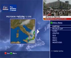 Da oggi nessuno si chiederà più se è il caso di prendere l'ombrello prima di uscire di casa o se è meglio rimandare il pic-nic in montagna. Grazie al nuovo servizio Class Meteo-The Weather Channel infatti, sul digitale terrestre è possibile vedere le previsioni del tempo personalizzate sino alla localizzazione del codice postale. Il servizio interattivo offerto dal canale ClassNews/MSNBC consente infatti, inserendo un qualsiasi codice postale, di vedere che tempo farà nella località corrispondente. E' sufficiente sintonizzarsi sul canale ClassNews, nel quale, come anticipato da ADVexpress (vedi notizia correlata), stanno confluendo i due canali americani The Weather Channel e MSNBC, e agire semplicemente sul proprio telecomando.