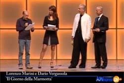 Saliti sul palco in veste di conduttori de 'Il Giorno della Marmotta' su Rai Radio 2, per ritirare il Premio Speciale dell'Editore Miglior Programma Radiofonico, i due, sotto gli occhi della conduttrice Susanna Messaggio e del presidente di ADCGroup Salvatore Sagone e in compagnia dell'immancabile Marmotta di peluche, hanno ironizzato su politica e attualità, provocando l'ilarità della platea.
