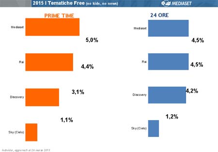 "Puntiamo al rafforzamento delle reti esistenti - ha aggiunto Paolini -, crediamo che in particolare per La 5 e Italia 2 ci siano importanti margini di crescita. I risultati sono ottimi in termini di ascolto e la raccolta è attualmente in linea con gli obiettivi 2015".