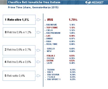 Come ha dichiarato Marco Costa ai microfoni di ADVexpressTv, il bouquet tematico free Mediaset destinato al grande pubblico si colloca al vertice della prima serata con il 5% di share e occupa la prima posizione in classifica anche nel daytime con il 4,5%, considerando il minor numero di canali rispetto a Rai. Guardando alle performance dei singoli canali, dalla classifica delle reti tematiche free italiane emerge che Iris è saldamente al primo posto con l'1,70% di share; Top Crime occupa la terza posizione con share pari all'1,12% e La5 è al sesto posto con lo 0,99% di share.