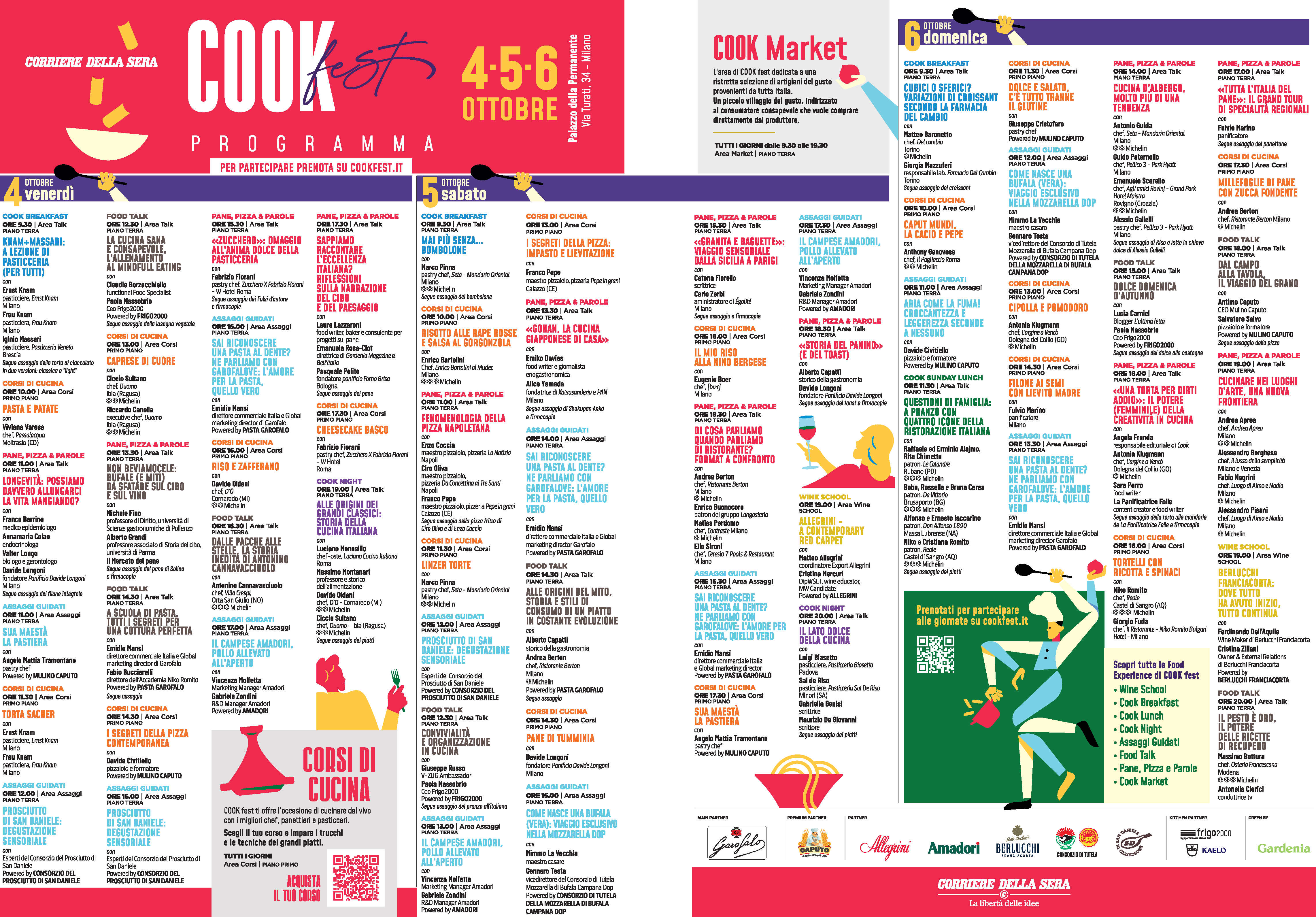 Completano il palinsesto, a ingresso libero con prenotazioni su cookfest.it, i Food Talk, da vedere anche online su corriere.it, momenti di confronto e approfondimento sulle tematiche del settore con chef e protagonisti del food, e Pane, Pizza & Parole, le interviste con chef, scrittori e opinionisti accompagnati da deliziose sfornate di un panificatore che farà degustare una sua ricetta.