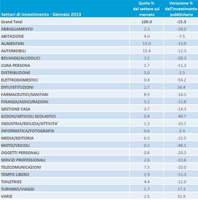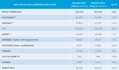 Il mercato pubblicitario ha iniziato il 2013 con un trend di riduzione della decrescita (rispetto al -18% di dicembre e al -23,1% di novembre 2012). Da segnalare, oltre al -15,3% di gennaio 2013, anche il -11% di aziende investitrici e il -4% di budget medio investito. In calo tutti i principali settori: automobili e alimentari lasciano sul campo circa 10 milioni di euro ciascuno. Atteso un miglioramento nella seconda parte del 2013, sia per effetto di un rimbalzo tecnico, sia per il possibile diradarsi delle incertezze politiche.