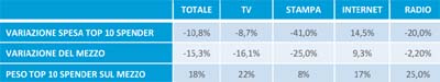 Il confronto tra i mezzi sui 10 top spender rivela che, a eccezione della stampa, dove hanno ridotto gli investimenti (-41%) molto di più rispetto alla media del mezzo (-25%), su tutti gli altri mezzi, i primi 10 investitori hanno ridotto meno della media del mezzo i loro investimenti, e su internet hanno investito addirittura di più (+14,5%).