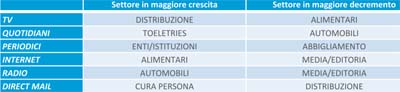 Tuttavia, non siamo in presenza di ‘vasi comunicanti’, perché la crescita sul mezzo internet, in valore assoluto, vale meno del 10% del disinvestimento sulla tv (ogni 10 euro tolti alla tv, 1 euro va a internet). Diverso il rapporto per il settore automobili, dove per ogni 10 euro disinvestiti dalla stampa, 5 vanno alla radio. La distribuzione torna, invece, a essere il settore che in tv cresce di più in valore assoluto.