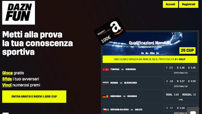 Numerosi i premi che si ottengono giocando su DAZNFUN.it tra cui buoni Amazon e abbonamenti alla piattaforma DAZN.