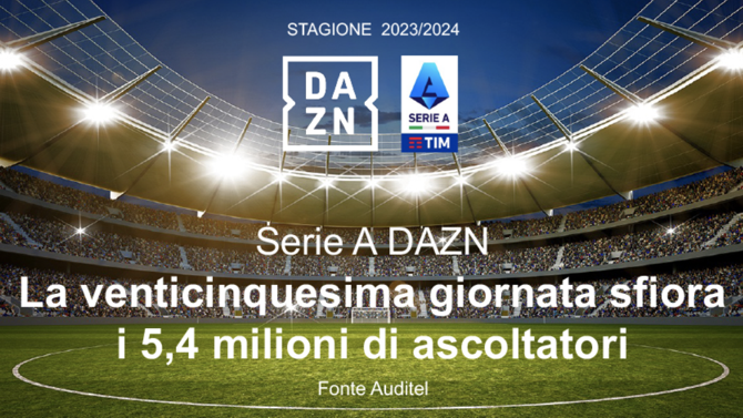 La venticinquesima giornata DAZN serie A 2023/2024 sfiora i 5,4 milioni di ascoltatori.
