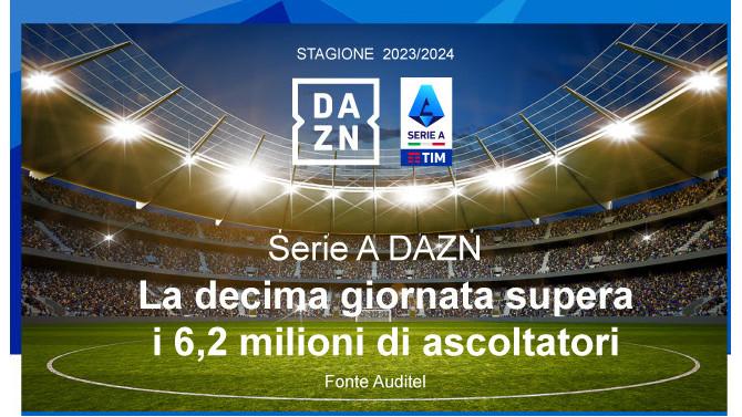 Per la serie A DAZN la giornata 10 stabilisce il nuovo record stagionale di ascolti: supera i 6,2 milioni di ascoltatori grazie ai risultati realizzati dai due big match di giornata: Inter-Roma domenica alle 18.00 con 1,7 milioni e Napoli-Milan domenica sera alle 20.45 che ha superato 1,6 milioni che diventano rispettivamente il secondo e il terzo match più visti da inizio stagione.