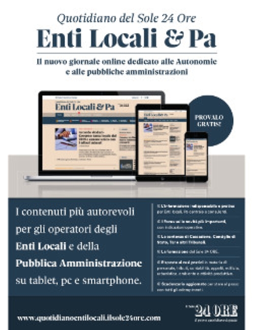 Il “Quotidiano del Sole 24 Ore Enti locali & Pa” è uno strumento veloce, facile da utilizzare e consultabile in qualunque momento da qualunque dispositivo (pc, tablet e smartphone) che offre quotidianamente tutta l’informazione autorevole e necessaria per chi lavora all’interno delle amministrazioni pubbliche: non solo gliamministratori pubblici e i responsabili a livello “centrale” nei vari profili di competenza - sindaci, segretari, consiglieri, dirigenti, funzionari - ma anche tutti i professionisti della consulenza legale, del lavoro, fiscale, contabile, tecnicache mettono le loro competenze a disposizione della PA.