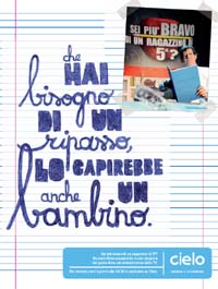 Il potenziale comunicativo di tutti i mezzi è stato sfruttato al massimo per ribadire il concept che è alla base del posizionamento di Cielo: lo stupore. Particolare la declinazione realizzata su Vanity Fair: il lettore è stato sorpreso ritrovando nella foliazione del magazine il classico foglio protocollo usato a scuola.
