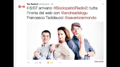 Inizia oggi alle 18 su Radio2 Rai "i Sociopatici" con Francesco Taddeucci, Andrea Delogu e Saverio Raimondo. Si tratta di un viaggio nelle notizie e nell'attualità dal punto di vista dei social.