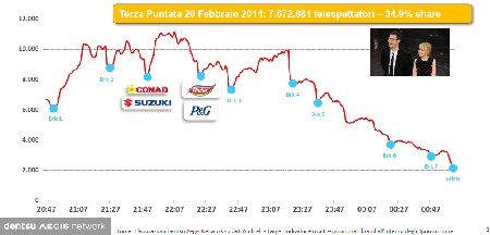 con quello della seconda serata e in calo di circa 3 mio di telespettatori rispetto al 2013. Picco di ascolto di oltre 11 milioni di telespettatori alle