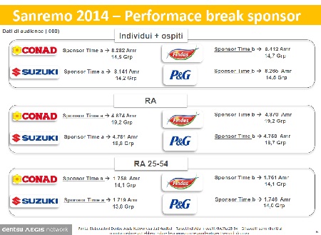 Gli spazi Sponsor Time dedicati a Conad, Suzuki, Findus e P&G hanno raggiunto un ascolto di circa 8 milioni di individui in calo rispetto agli 11-12 milioni del 2013.