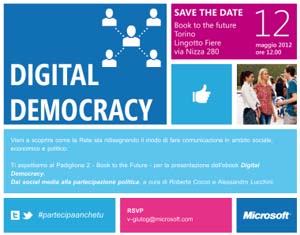 Sabato 12 maggio, presso il Salone del Libro di Torino, è fissato l'appuntamento con il lancio di 'Digital Democracy - dai Social Media alla partecipazione Politica', a cura di Roberta Cocco e Alessandro Lucchini. Si tratta di un e-book realizzato in pieno stile wiki, con una redazione diffusa, una larga partecipazione di giovani autori e numerose case history importanti: dagli USA di Obama alla primavera araba, dalla Russia ai casi italiani più recenti ed emblematici.