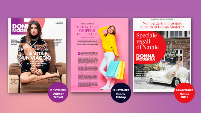 Donna Moderna, il brand del Gruppo Mondadori punto di riferimento nel segmento dei femminili, lancia questo mese tre numeri speciali, dedicati a tematiche di grande interesse per le lettrici: dalle mete per le vacanze invernali, allo speciale Black Friday, con una guida agli sconti, fino ai regali di Natale, immancabile appuntamento di shopping ed evasione.