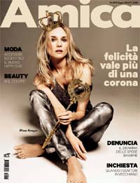 Dal 21 maggio Amica, il mensile femminile di RCS diretto da Cristina Lucchini, è in edicola in doppio formato. A partire dal numero di giugno sarà infatti possibile scegliere l’Amica giusta per sé: nel consueto formato standard, nel nuovo formato travel o su iPad. Cover girl del numero di giugno di Amica l’attrice Diane Kruger e le interviste a Zahia Dehar, Benjamin Skepper, Donatella Finocchiaro, Alessio Carbone. E ancora, le foto di una giovanissima Carla Bruni pubblicate nel 1987 sulle pagine di Amica, accompagnate da definizioni-presagio di un futuro all’Eliseo, a cominciare dal titolo del servizio: "Oui, je suis…", il reportage fotografico sulle spose bambine di Stephanie Sinclair, primo premio nella sezione Contemporary issues al World Press Photo 2012 e l’inchiesta sul ribaltamento di ruoli tra figli e genitori, che con l’età di colpo diventano più fragili, oltre al grande amore, quello tra Carly Simon e James Taylor, definiti 'i Grace e Ranieri del rock'.
