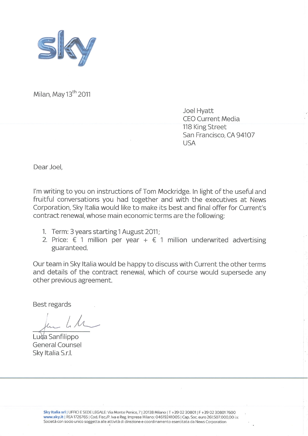 Ecco perchè il Ceo Tom Mockridge ha cancellato le cifre dalla lettera del 13 maggio. (In allegato la stessa lettera ma con le cifre leggibili). Current non ha mai chiesto 10 milioni di dollari. La sola richiesta avanzata, in relazione all'offerta del 13 maggio, era di un incremento di 0.02 euro per abbonato (quindi circa 1 milione di euro in più all'anno). Ora Sky sostiene che il fax inviato il 22 aprile era solo l'inizio della negoziazione. Il 29 aprile Tom Mockridge ha inviato una nuova lettera che confermava, a scanso di equivoci, la decisione di cancellare Current: "Caro Joel, tanto per fugare ogni dubbio, non abbiamo mai parlato di alcun rinnovo televisivo per Current, né a pranzo né via mail". E infine la lettera si chiudeva con la data di fine delle trasmissioni di Current Italia: 31 luglio.