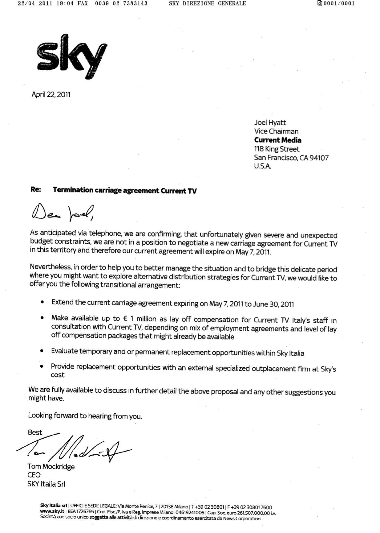 Current conferma: 'Sky ha deciso unilateralmente di cancellare il canale, senza nessun preavviso e senza nessuna ragione imputabile alle performance del canale. Con un fax inviato il 22 aprile 2011 a firma Tom Mockridge (vedi fax in allegato) viene comunicata a Current la cancellazione del canale senza alcuna possibilità di negoziazione e senza alcuna offerta di rinnovo. Una decisione perentoria e irrevocabile, tanto da contenere soltanto le necessarie note legali per il licenziamento dell'intero staff italiano.Per protestare contro tale decisione il top management di Current, compresi i fondatori Al Gore e Joel Hyatt, sono riusciti a incontrare personalmente James Murdoch, figlio del presidente di News Corp. Rupert Murdoch, solo il 10 maggio a Los Angeles. Il 13 maggio, probabilmente preoccupati da una possibile reazione dell'opinione pubblica, Sky ha inviato per nascondere le proprie reali intenzioni la sua unica e inaccettabile offerta (1milione di euro, la stessa cifra che avevano proposto per chiudere il canale, meno di 1/3 del corrispettivo annuale dal 2008 al 2011, cioè circa 3.2 milioni di Euro). Un affronto a cui Joel Hyatt ha risposto con la mail di seguito riportata: "deve trattarsi di un errore tipografico".