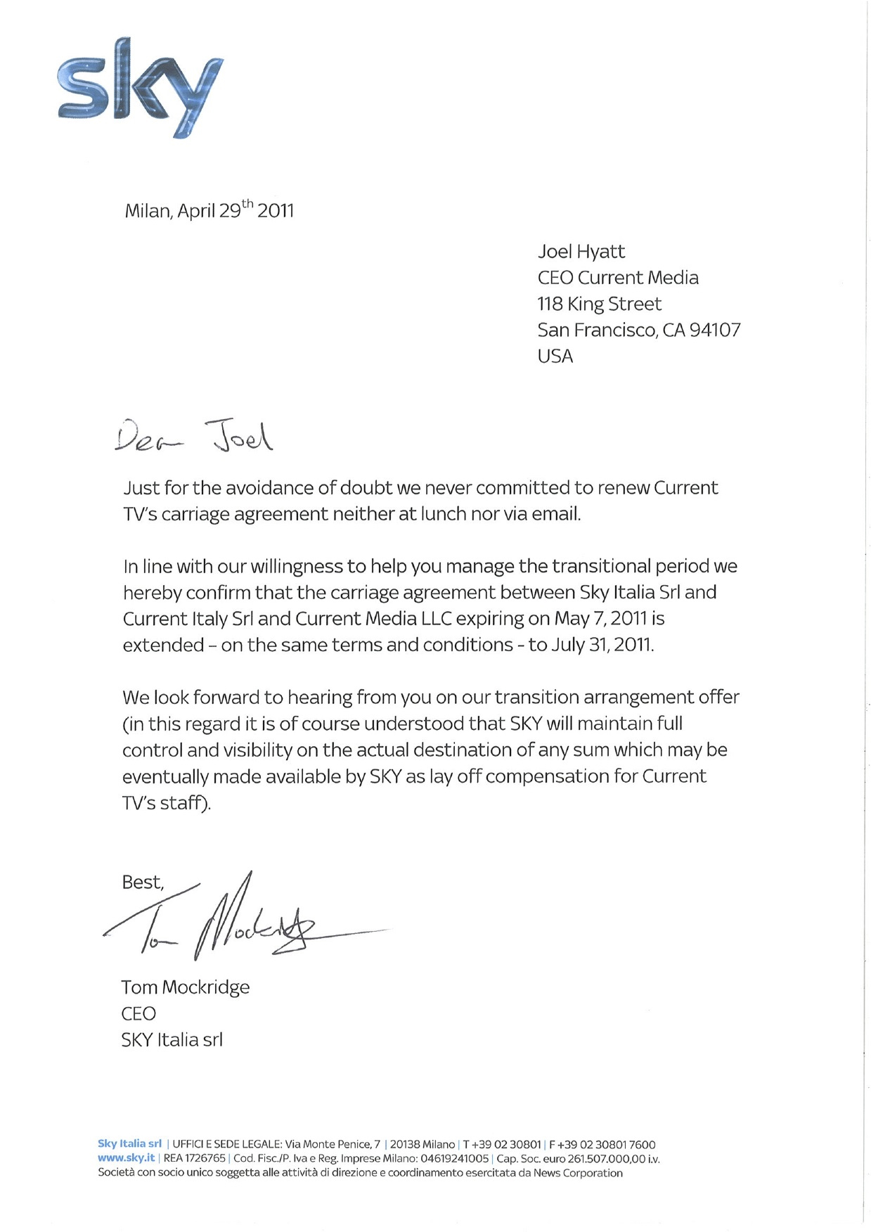 Prima del 22 aprile, Tom Mockridge aveva incontrato Joel Hyatt a Milano, di preciso l'8 aprile, per confermare la soddisfazione di Sky per il lavoro svolto da Current Italia e assicurare che non c'erano dubbi sulla continuazione di una collaborazione di così largo successo. Current Italia era così importante per la piattaforma Sky da chiedere al management del network di Al Gore di valutare l'ipotesi di spostarsi dal pacchetto Intrattenimento a quello delle News per incentivare e rafforzare gli abbonamenti assieme a SkyTg 24.