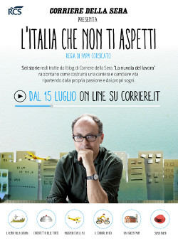Ha esordito martedì 15 luglio il nuovo docuweb del sito di Corriere della Sera “L’Italia che non ti aspetti” ideato e realizzato dal regista Pappi Corsicato, e alla seconda puntata ha registrato già l’ottimo risultato di oltre 100.000 streaming.“L’Italia che non ti aspetti” si avvale della preziosa collaborazione del regista Pappi Corsicato, che ha diretto film per il cinema, opere liriche, documentari, e che sul sito del Corriere della Sera esordisce con un progetto per il web: “L’idea è quella di far passare un messaggio positivo in un momento di crisi attraverso storie di persone comuni che hanno messo in atto la loro creatività e passione per uscire da un momento di stallo. La mia massima aspirazione è che queste storie vere e molto concrete siano spunto e riferimento per mettersi in discussione”, commenta Pappi Corsicato.