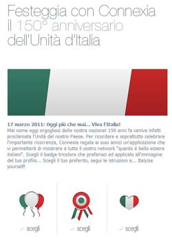 Connexia, agenzia di comunicazione con focus sulle attività di Relazioni Pubbliche, Internet PR e Interattività Online, ha sviluppato un’applicazione Facebook che permette a tutti gli utenti di personalizzare l’immagine del proprio profilo dimostrando il proprio orgoglio tricolore.L’applicazione '150 anni', raggiungibile alla pagina Facebook dell’agenzia, http://www.facebook.com/Connexia, consente di scegliere tra 3 badge tricolore, una coccarda, un cuore e tre palloncini, che verranno visualizzati in basso a destra sull’immagine del proprio profilo sul social network.
