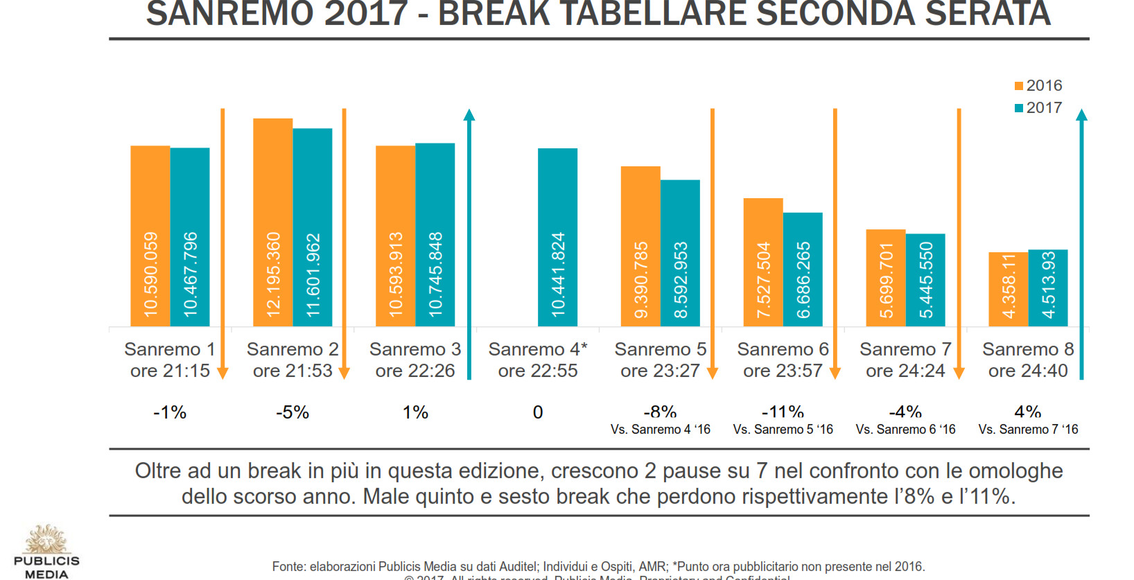 Per quanto attiene ai break pubblicitari, come rileva Publicis Media nel report inviato oggi, 9 febbraio, anche nella seconda serata è andato in onda un break in più rispetto alla passata edizione. Soltanto il terzo e l’ultimo guadagnano nel confronto con gli omologhi, mentre Sanremo 5 e Sanremo 6 hanno perso rispettivamente ben l'8 e l’11% di ascolto.