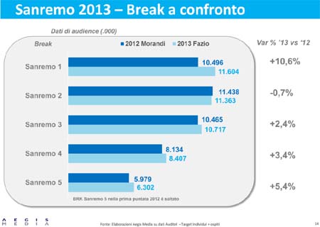 Come evidenzia l'analisi di Aegis Media Expert, dal punto di vista pubblicitario si sono registrate ottime performance per la tabellare. Il break che ha ottenuto più ascolti è stato il Sanremo 1 con 11.6 mio di telespettatori e un +11% vs l’omologo del 2012. (In allegato in alto a destra le tabelle).