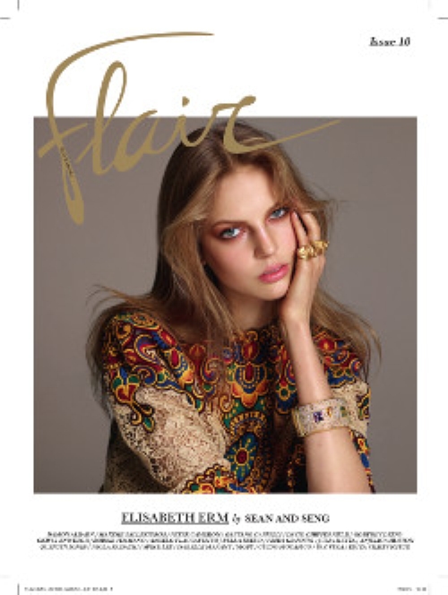 Il nuovo numero di Flair , in edicola dal 27 marzo , ritrae in copertina la modella Elisabeth Erm fotografata da Sean&Seng . Tra le tante storie, un faccia a faccia su rock e moda con Frida Giannini , direttore creativo di Gucci; un’anteprima della biografia di Anjelica Huston ; l’inchiesta sull’impatto della rivoluzione tecnologica sul fashion; la storia di John Casablancas , fondatore dell’agenzia Elite e inventore del fenomeno delle top model. E un’esclusiva: una conversazione con Okwui Enwezor , curatore della Biennale d’Arte di Venezia 2015. Non mancano le tendenze della nuova stagione, fra reinterpretazioni neoclassiche, ispirazione tribale e ritorni pop degli anni ‘70, raccontate dai fotografi Robbie Fimmano, Paola Kudacki, Quentin Jones e Guido Mocafico.