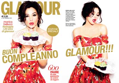 Per l'importante traguardo inoltre un numero celebrativo, quello di aprile, che ha in copertina Monica Bellucci, apparsa per la prima volta sulla cover del magazine nel 1995, quando, ancora modella, studiava per diventare attrice. Oggi è la fotografa Ellen Von Unwerth a ritrarla in atteggiamenti insoliti e festosi, in un appartamento parigino, alle prese con la torta di compleanno di Glamour. Le immagini sono corredate da un’intervista a cura di Chiara Gamberale in cui l’attrice e la scrittrice fanno una riflessione ampia sull’universo femminile e sulla bellezza delle donne.