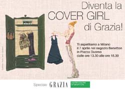 Dopo il successo dello scorso anno, il settimanale Mondadori Grazia, diretto da Vera Montanari, ripropone l’iniziativa Diventa la cover girl di Grazia! sempre in collaborazione con Benetton, azienda attiva nel settore dell’abbigliamento.Tutte le lettrici di Grazia potranno diventare modelle per un giorno recandosi nei negozi United Colors of Benetton (iniziativa riservata a coloro che hanno compiuto i 14 anni), selezionati e allestiti con backstage per l’occasione: lì saranno accolte da un’équipe di stylist, esperti di make-up e hair stylist di Grazia, che le vestiranno e le acconceranno come delle vere e proprie dive; una volta pronte, le ragazze potranno posare per una copertina limited-edition del settimanale Mondadori.