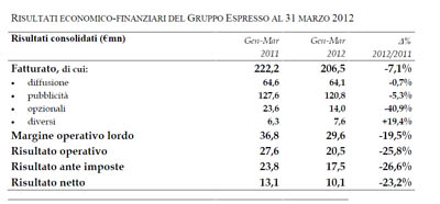 Andamento della gestione del Gruppo Espresso nel primo trimestre 2012.
