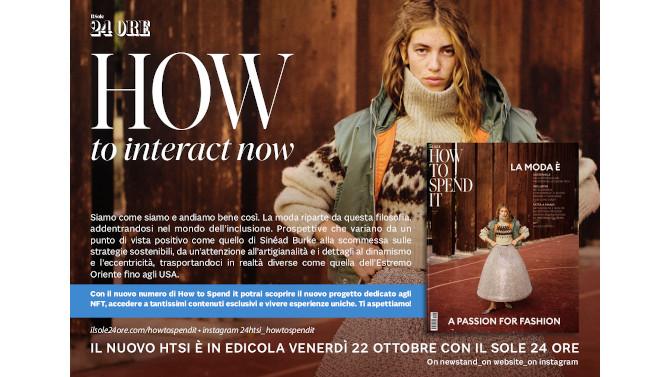 Quattro i focus: sostenibilità, tema ormai caro ad How To Spend It e imprescindibile oggi per la moda. Fra i protagonisti di eco-tech, Anya Hindmarch, la geniale business women nota per la collezione “I’m not a plastic bag” e che oggi lancia la collezione opposta “I’m a plastic bag” una borsa rigorosamente di plastica riciclata. Secondo focus: inclusività. Una moda capace di valorizzare la diversità. Con un’intervista esclusiva a Sinéad Burke, disabile che ha sfilato per Gucci. Terzo: fatto a mano, ormai sinonimo di alta qualita che si basa sul lavoro artigianale, sulla sartorialità, su un made in Italy radicato nei singoli territori e nelle singole regioni. Su How To Spend It l’anteprima di una mostra dedicata ai migliori atelier italiani. Quarto: dopo le iniziative dei due numeri di settembre con il lancio della serie podcast “Pillole di Design” e l’uscita del libro “L’Italia in 50 vetrine”, anche l’uscita dello speciale A Passion for Fashion, venerdì 22 ottobre, sarà accompagnata da un’iniziativa speciale: DIY NFT - Do It Yourself experience, la prima versione non fungible token di How To Spend It. Con la nuova Web App di A Passion for Fashion, attraverso il QRcode dedicato, gli utenti potranno accedere a contenuti esclusivi, immagini inedite, approfondimenti in versione one of a kind, giocare, guadagnare punti e vivere esperienze esclusive.