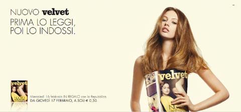Per meglio presentare il nuovo magazine, il primo numero del restyling di Velvet sarà distribuito mercoledì 16 febbraio 2011 in regalo con la Repubblica. Dal giorno successivo le lettrici potranno acquistarlo al prezzo straordinario di lancio di soli 0,50€.