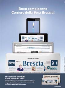 Il Corriere della Sera Brescia compie un anno e i lettori premiano il dorso dedicato alla città e al suo territorio con ottimi risultati, sia sulla carta che sul web.Oltre 100.000 bresciani - 30.000 in più rispetto all’anno precedente - leggono ogni giorno il Corriere della Sera Brescia. La sua edizione online ha 3 milioni di pagine viste ogni mese con più di 420.000 contatti unici e con ottimi risultati su tablet. La raccolta è curata da Sale’s solutions.