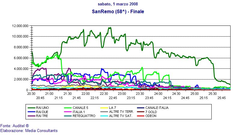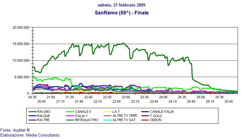 Il Festival sabato 21 ha sbaragliato la concorrenza degli altri canali (nel grafico sottostante l'audience delle varie reti a confronto).