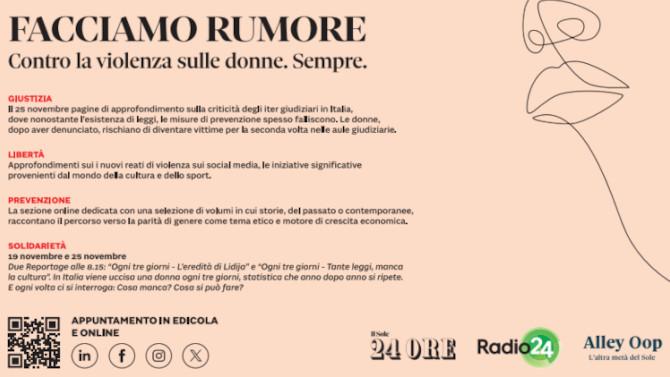 Il Gruppo 24 ORE al fianco di tutte le donne per far rumore: uno Speciale del Sole 24 Ore, un Dossier Online de ilsole24ore.com, una raccolta di libri e programmi dedicati al tema su Radio 24