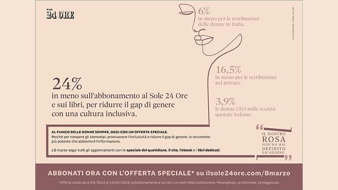 Il Sole 24 Ore è al fianco delle donne sempre, oggi e fino al 15 marzo con un’offerta speciale, per ridurre il gap di genere con una cultura inclusiva.