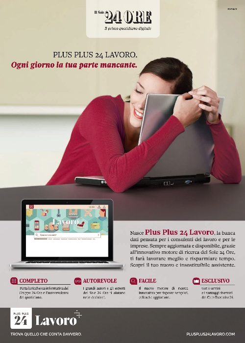 Il Gruppo di via Monterosa prosegue la sua strategia multimediale e arricchisce la sua offerta per i professionisti e in particolare per chi si occupa di lavoro: è on line PlusPlus24 Lavoro, una nuova banca dati che semplifica l’attività di consulenti del lavoro, giuslavoristi, direttori del personale e di tutti coloro che devono ogni giorno confrontarsi con le norme, la giurisprudenza e la prassi fornendo tutto ciò che serve, nel minor tempo possibile e con la massima semplicità d’uso. A supporto adv pianificato sui mezzi del Gruppo.