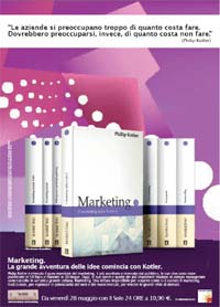 Philip Kotler è il guru mondiale del marketing, le sue idee sono state pubblicate in 58 Paesi e tradotte in 20 lingue. Oggi le sue opere e quelle dei più importanti studiosi di cultura manageriale, italiani e internazionali, sono raccolte dal Sole 24 Ore in un’unica grande collana: 'Marketing'.12 volumi, in edicola con il quotidiano ogni venerdì a partire dal 28 maggio, per scoprire come si è evoluto il marketing tradizionale, esplorare le potenzialità del web e dei nuovi mercati, vincere le grandi sfide di domani.