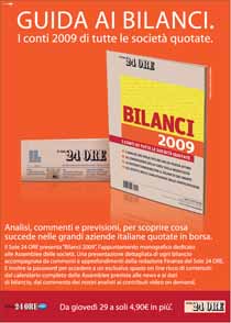 In edicola per un mese a partire da giovedì 29 aprile la guida “Bilanci 2009” che analizza i conti di tutte le società quotate a Piazza Affari in occasione delle assemblee di fine aprile. Come ogni anno torna in edicola l’appuntamento monografico dello Speciale del Sole 24 ORE con la presentazione dettagliata di ogni bilancio, accompagnata da commenti e approfondimenti della redazione Finanza del quotidiano.I testi sono inoltre corredati dalle tabelle riassuntive sui conti 2009 a confronto con l’esercizio precedente e dall’andamento di Borsa degli ultimi dodici mesi. Una particolare attenzione è stata riservata alle conseguenze della crisi sulla redditività, alle ristrutturazioni per il rilancio dei gruppi e agli effetti delle svalutazioni delle partecipazioni. Quest’anno ai lettori della guida Bilanci 2009 viene riservata anche l’opportunità di continuare ad aggiornarsi online, accedendo in esclusiva a contenuti di approfondimento sul sito www.ilsole24ore.com: dal calendario completo delle Assemblee previste alle news e ai dati di bilancio, dal commento dei nostri analisti ai contributi video on demand.